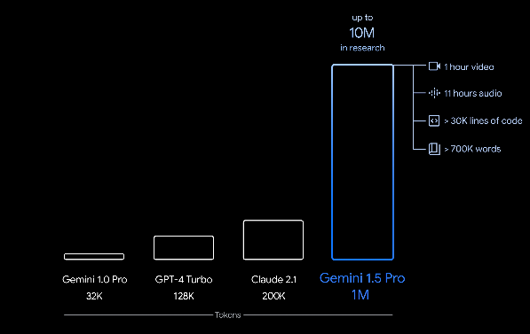 - Ability to process one-hour videos, 11 hours of audio, and over 30,000 lines of code